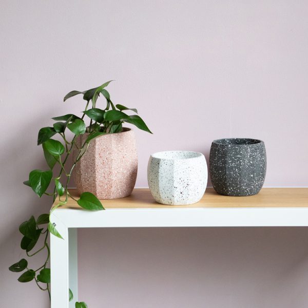 • Concrete indoor planter pot with a terrazzo look speckled finish